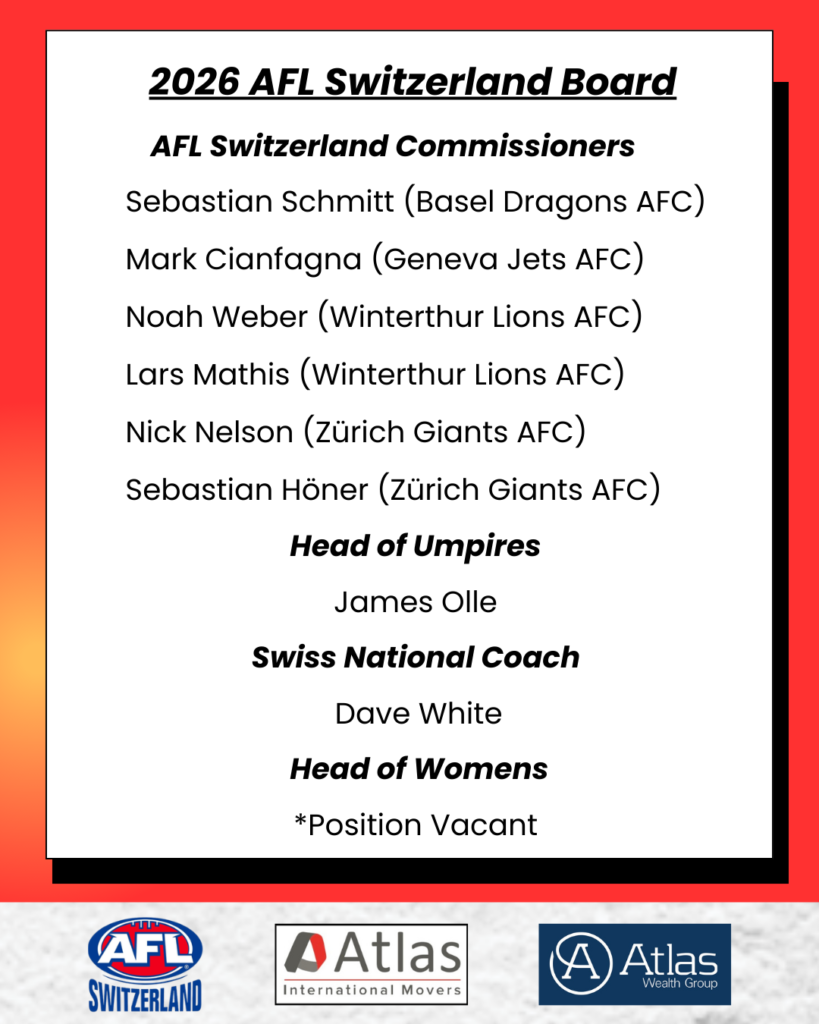 AFL Switzerland 2026 Committee Posted on Wednesday March 18th, 2026 by admin The 2026 AFL Switzerland Committee is locked in and ready for another fun year of footy all around Switzerland.All clubs are still looking for players, supporters and volunteers, so please donât hesitate to reach out to us or a club in your area!